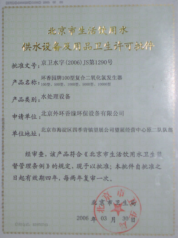 供水设备及用品卫生许可批件